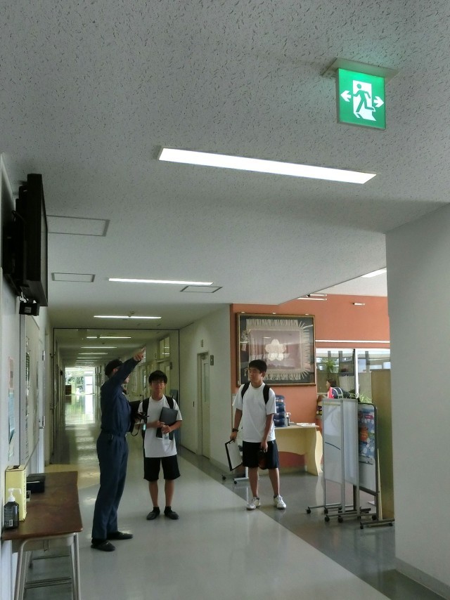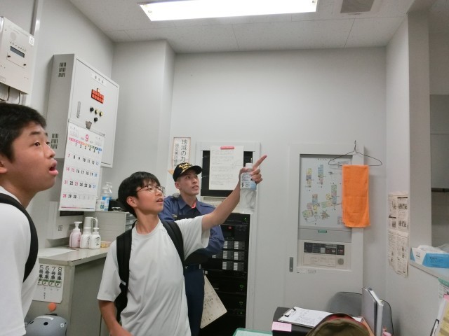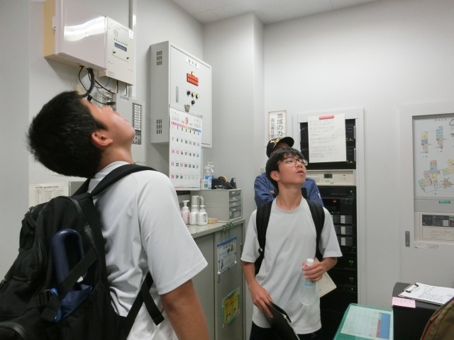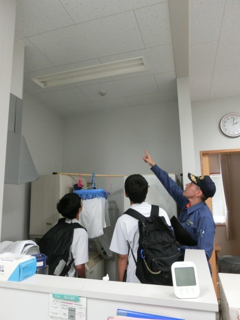 主事室の火災警報盤や探知機の位置と種類などかなり専門的な質問にもしっかり答えている姿には感心させられました。消防署の方は『この2人はすごい数の質問をしてきてくれるので逆にこちらが驚いています』との事。まだ職場体験1日目なのにすごいです。2年生の成長が楽しみになりました(菅野)