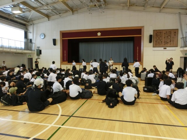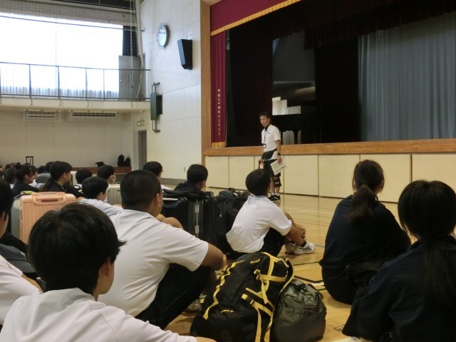 今朝8時の体育館。1年生が大きな荷物を持って集まっています。校長先生からは「今日から3日間は、いま皆さんの横にあるような大きな荷物を持っているなど、日常とは違う3日間を過ごします。このことを意識して、まずは安全に過ごし元気な姿で学校に戻ってくることが一番。そのうえで大いに楽しんできましょう」というお話をいただきました(菅野)