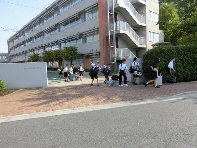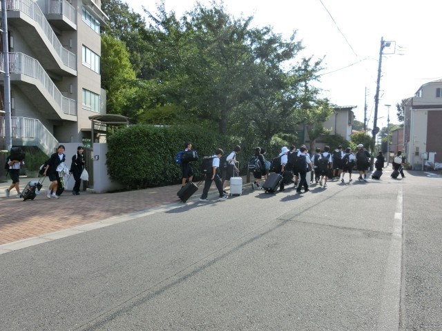 大きな荷物を持ってバスへ向かいます。9月なのに朝からかなりの高温ですが、1年生の表情には笑みがこぼれます(菅野)