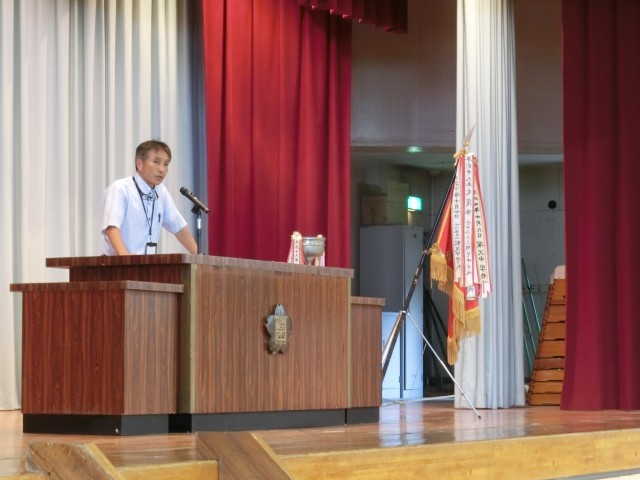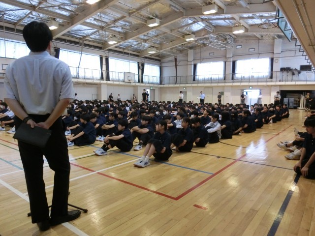 今日の全校朝会は、生徒会役員の認証式や連合陸上大会などの表彰が予定されていることもあり、壇上に立つ予定の生徒があらかじめ脇に出て準備をしていました。校長先生からは、先月修学旅行に出かけた3年生が、行く先々でお褒めの言葉をいただく場面が多かったという話がありました。お世話になる方々へのあいさつや集合した際の周囲への配慮など集団行動のあるべき姿を示してくれた3年生。下級生はぜひこの3年生の集団としての姿を、めざす目標にして学校生活を送ってください(菅野)