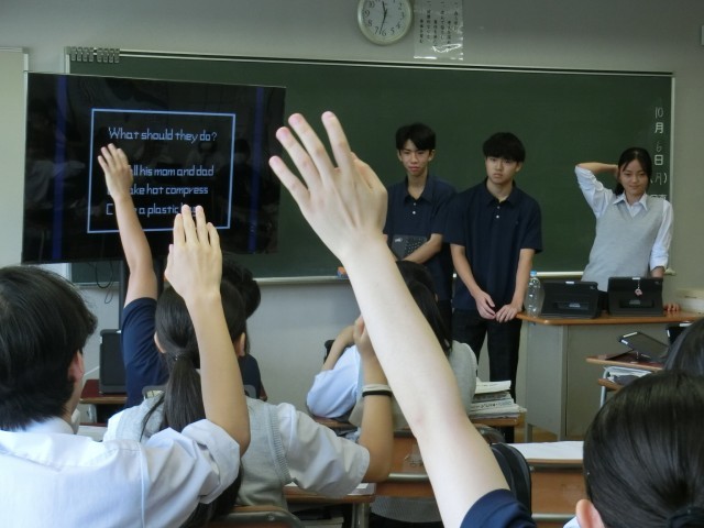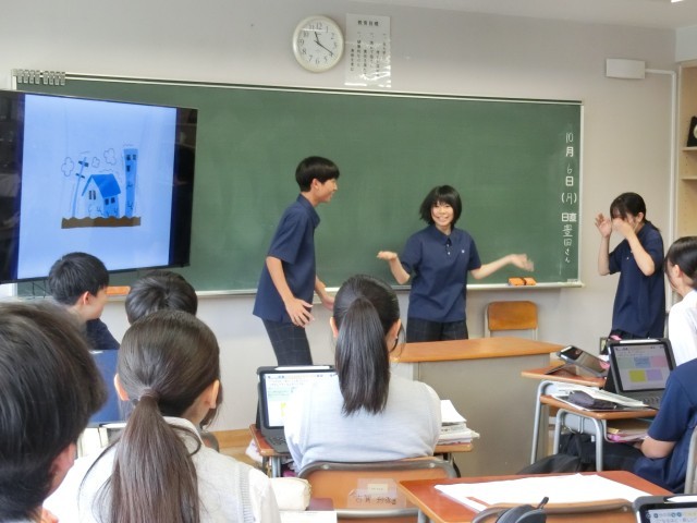 発表のタイトルは「地域の防災意識の向上」です。聞いている人を巻き込む発表ができるかがポイントという事を何度も言われているので、みな様々な工夫をしています。質問あり、表情あり、班員での掛け合いあり(菅野)