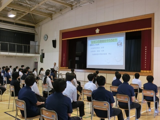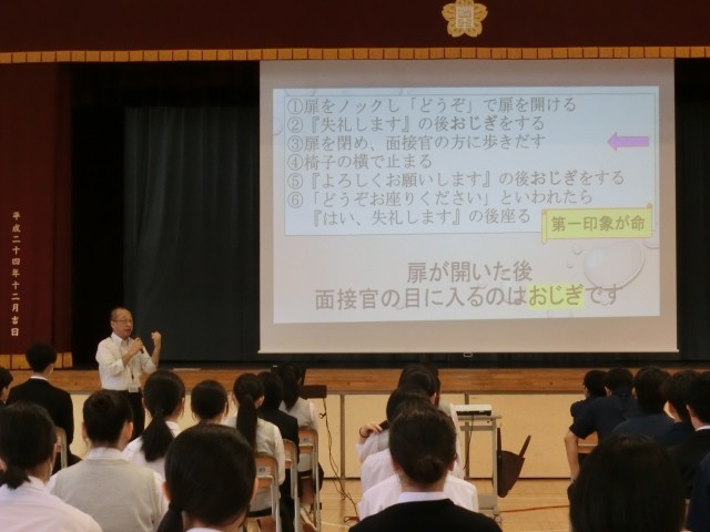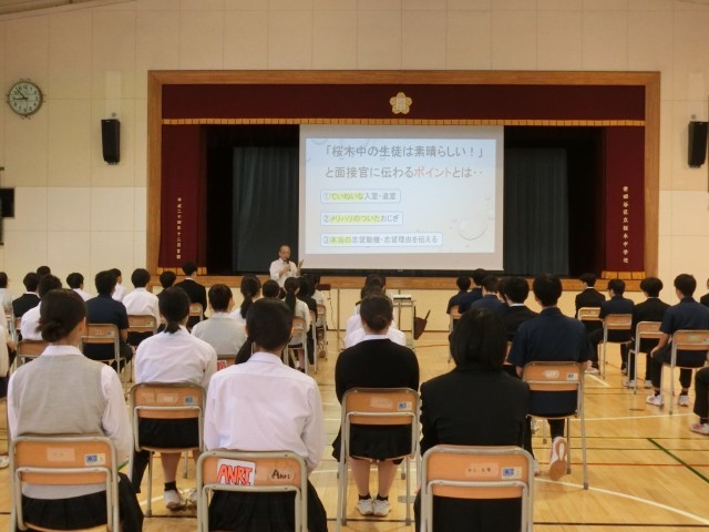 面接講座 公開日 2025/10/14 更新日 2025/10/14 今日のできごと 3年生は今月末の学芸発表会が終わるといよいよ進路選択に向けプログラムが目白押しになります。11月には校長先生に面接練習をしていただきます。その前に、必要なマナーを習得してもらおうと、区内の中学校校長を経験した先生が講師となり、校長面接対策講座を行いました。さすが桜木中3年生、聞くときの背筋が伸びています(菅野 画像:久保) いいね(1) 3年 キャリア教育