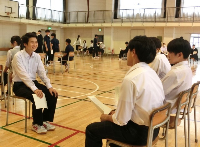 面接では緊張すると顔がこわばります。笑顔で明るくハキハキと!自分を表現できるかがポイントです。繰り返し練習あるのみ。頑張れ、桜木中生(菅野)