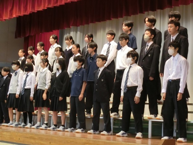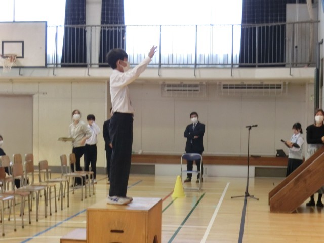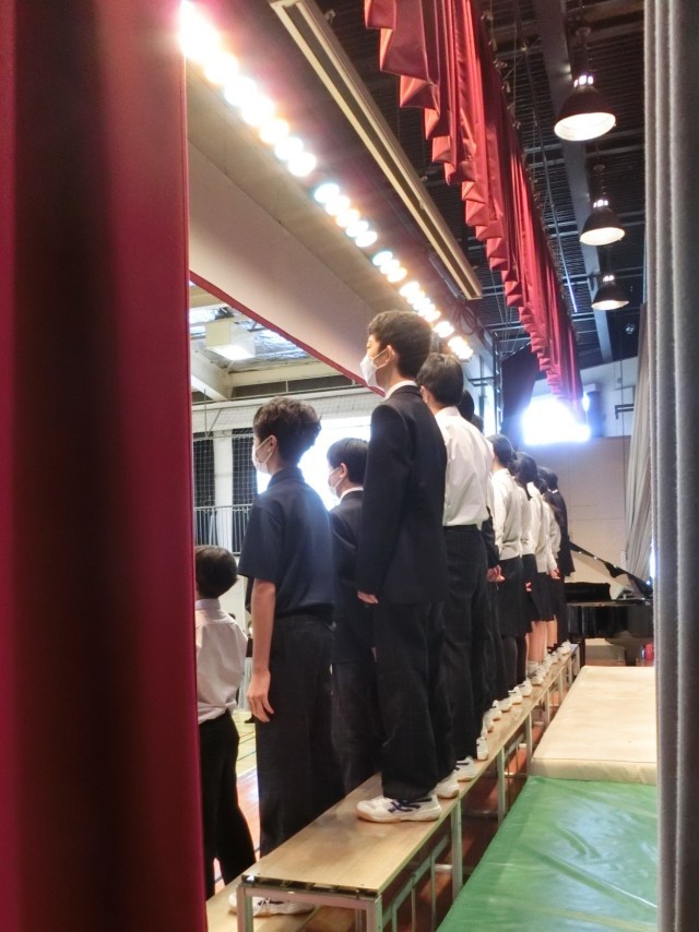 体育館フロアから見ると、落ち着いて堂々としている1年生。でも舞台袖に回り、そっとカメラを向けると、画面越しでも緊張感が伝わってきます(菅野)