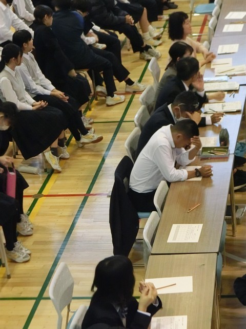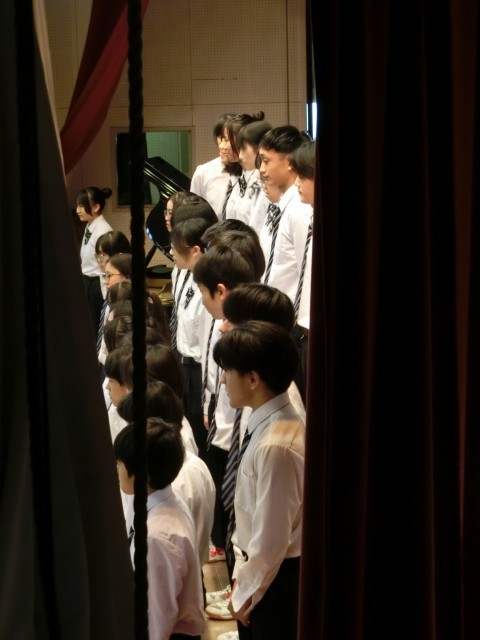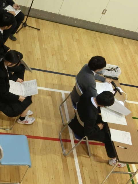 体育館のキャットウォークで撮影したワンショット3点。3年生の舞台の緊張感。各クラスあまりの出来の良さに頭を抱える審査委員。合唱を聞きつつ、次に読む原稿チェックを怠らない実行委員さん(菅野)