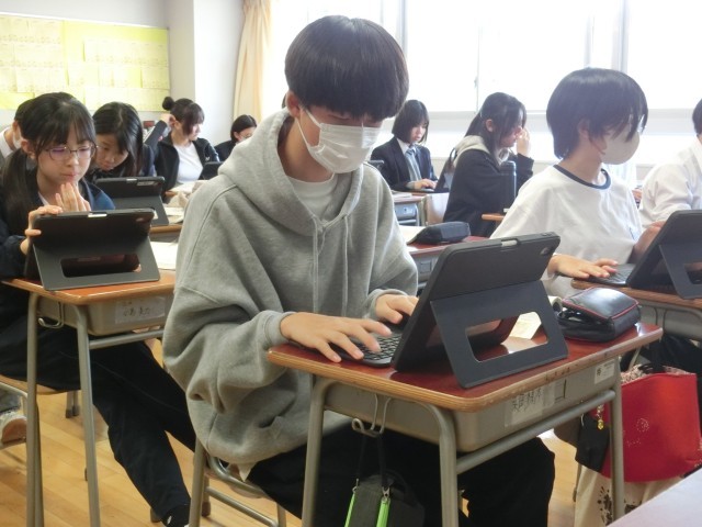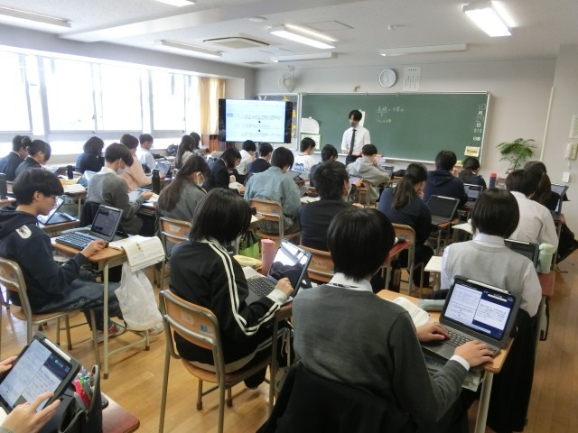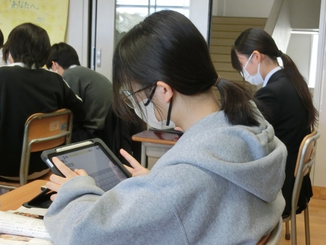 3年生国語の授業です。いつもと教室の雰囲気が異なるのは「今日が服装を考える日」だからですね。よりカラフルになり『公立高校の教』』と言われても違和感がない感じがします(菅野)