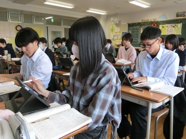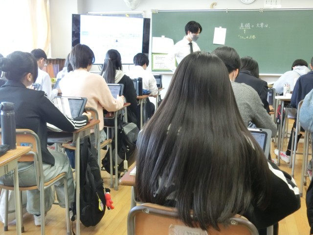 髪型も「服装を考える日」なので後ろで束ねていない生徒もいます。でも授業中に常に自分の髪を触り学習に集中できない、という生徒がいません。カチッと感は変わらず、さすが桜木中3年生です。タブレットに電子ペンでメモ書きをしながら思考をまとめている生徒がいました。キーボードは速さでは優りますが、脳を整理し思考力を高めるには手書きが優位と言われています。何事も一つのやり方に固執しない。教育界にもそんな時代が来ているのかもしれません(菅野)