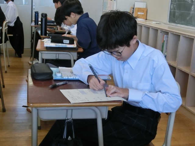 光の屈折について学んでいます。車の模型を使い、光が疎と密の空間を進むときの曲がり方や反射の特性を説明していました。ワークシートに定規とペンで記入する生徒たち。頑張っています(菅野)