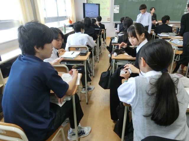 個体、液体、気体と変化する中で粒子の動きがどうなっているかを考察する勉強です。蝋を溶かした前回の実験から、冷えて固まった状態の個体を確認して話し合っています(菅野)