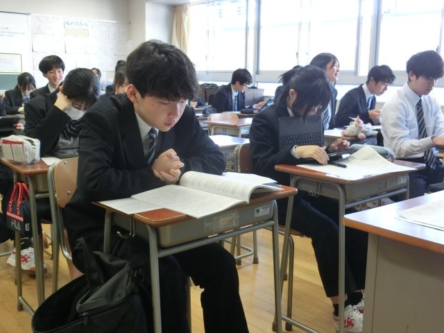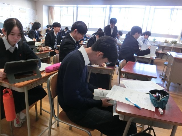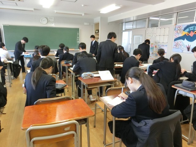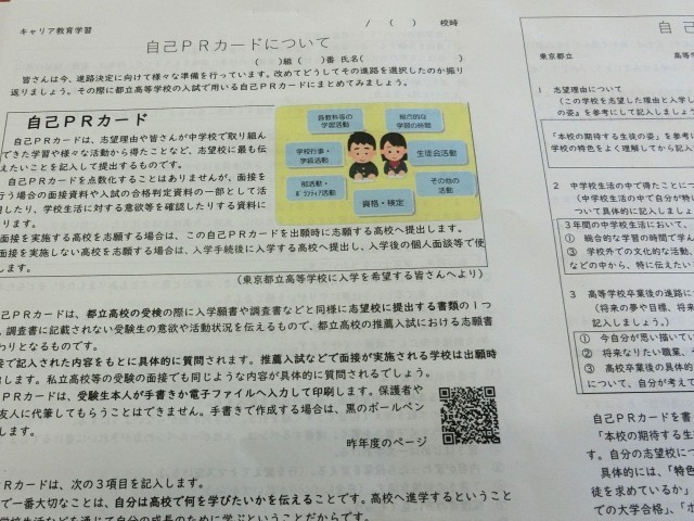 3年生が自己PRカードの作成に取り組んでいました。自分の事を相手にPRする、とはいえ「中学校で自分が成長できたこと」を、‘自慢話’にならないように表現するには、冷静な自己分析力と適切な表現力が問われます。真剣な表情になるわけですね(菅野)