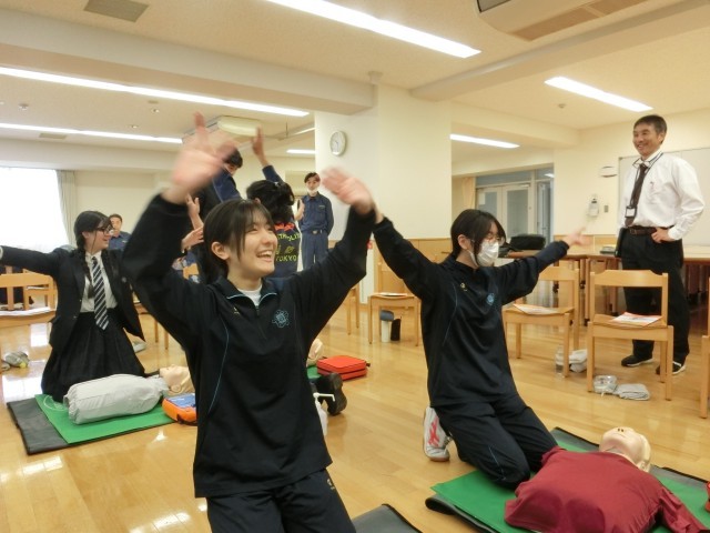 元気いっぱい 公開日 2025/11/18 更新日 2025/11/18 今日のできごと この画像を見る限り、すごく楽しそう(?)に見えますが、通常の呼吸が停止したのを確認した後、周囲の人に「119番通報をお願いします!」「あなたはAEDを持ってきてください」と大きなはっきりした声で伝えているところです。消防署の方に「中学生は恥ずかしがって声がでないのが普通なんだが、皆さんは元気があって明るくて素晴らしい!」とお褒めの言葉をいただきました(菅野) いいね(1) 3年
