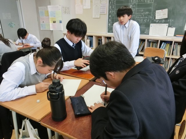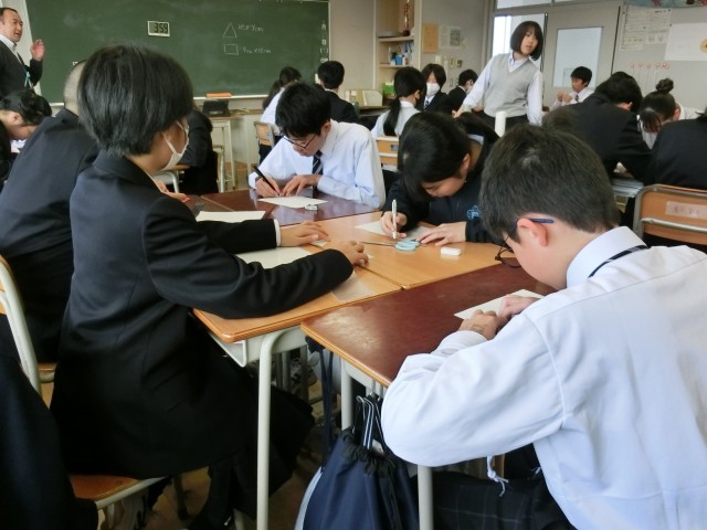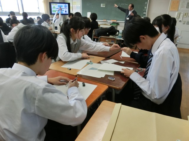 必死に働く国民を体験 公開日 2025/11/28 更新日 2025/11/28 今日のできごと 5分間のタイマーが始まると同時に、決められた寸法どおりの三角と四角の税、特産物づくりに励む各地の国民の班です(菅野) いいね(1) 授業 1年