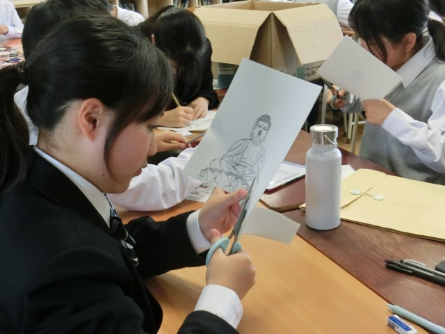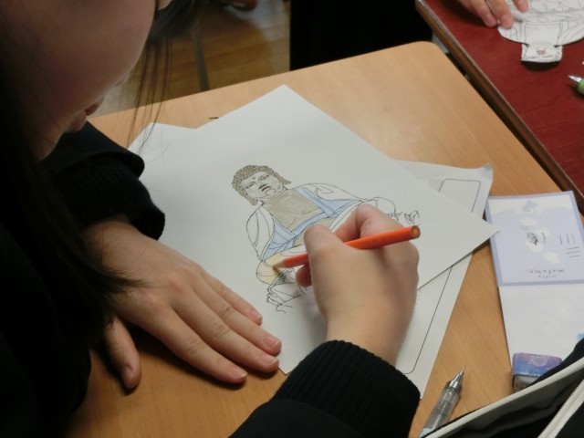 一方、くじ引きで朝廷を引き当てた班は余裕の表情です。「朝廷って暇ですね~」と本音が出ます。カメラを向けている私にも「お仕事お疲れ様です!」と気遣う言葉も。タイマーが鳴ると各国から税や特産物を納めにやってくるのを受け取ります。うーん、確かにやることがない…。そこで先生から大仏のイラストを渡され色付けを頼まれました。+5をタップすると生き生きと作業に励む朝廷班の姿を見ることができます。なるほど、こうやって朝廷が中心になって文化が広まっていくことを実感できたのですね(菅野)