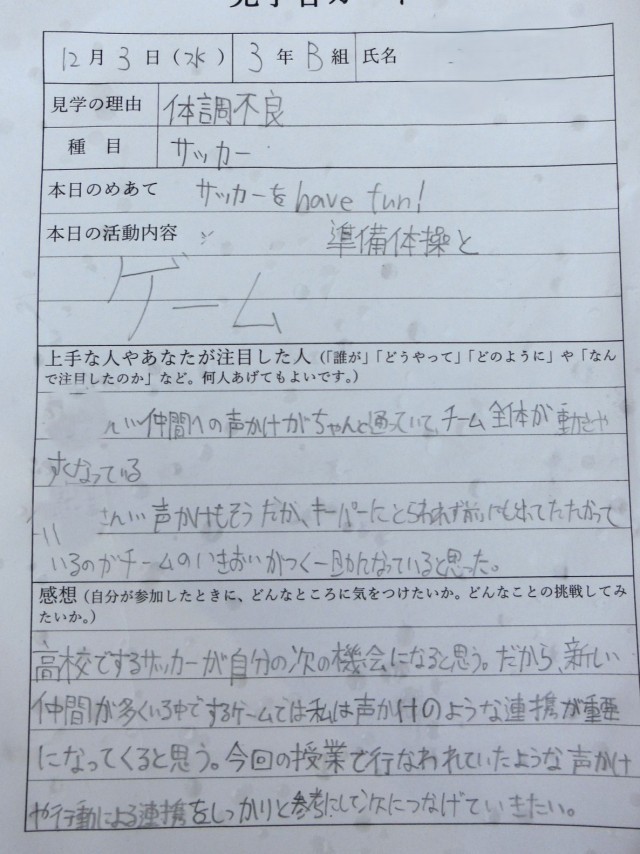 終りもきちんと 公開日 2025/12/03 更新日 2025/12/03 今日のできごと 授業の終わりも、片付けからあいさつまで3年生らしくしっかりした態度です。今日、体調不良で見学していた生徒に見学者カードを見せてもらいました。コート外に出たボールを拾う補助作業をやりつつ、このように友だちの動きをしっかり見ることがなんて…。頭が下がります(菅野) いいね(1) 授業 3年