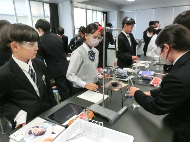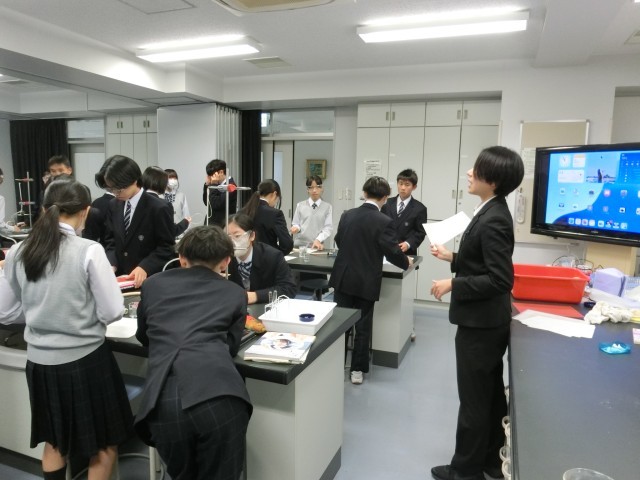 赤ワインを使う!? 公開日 2025/12/08 更新日 2025/12/05 今日のできごと 今日の1年生理科は「赤ワインを加熱して純粋なエタノールを取り出そう」をめざす実験です。火を使う実験でもあり、先生も生徒も入念に準備を進めています(菅野) いいね(1) 授業 1年