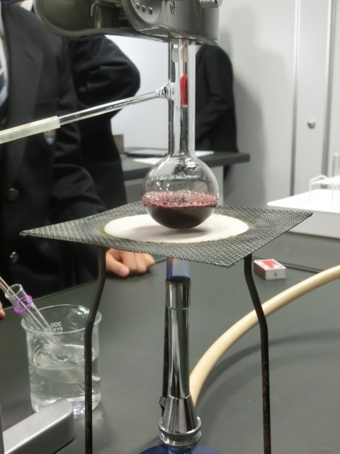 ポコポコの後は 公開日 2025/12/08 更新日 2025/12/05 今日のできごと 温めると、多くの班の赤ワインがポコポコ音をたてて沸騰し始めました。同時にエタノールが冷やされた試験管にたまります。見せてもらうと心なしか赤く(?)色づいているような…気のせいかなあ(菅野) いいね(1) 授業 1年