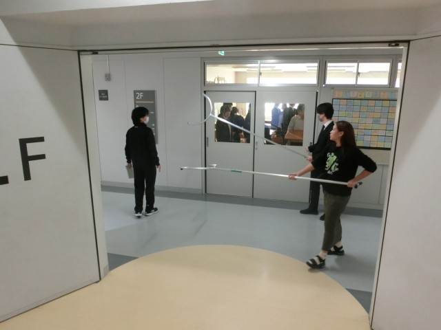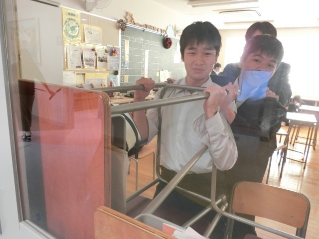 教室から職員室に連絡が入り、さすまたを持った先生たちが応援に駆け付けました。そして、教室では扉からの侵入を防ぐため机でバリケードを築いています(菅野)