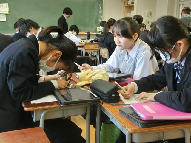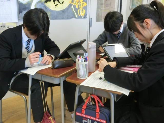 3年生の数学は定規とコンパスを使い、作図をしながら問題を解いています。3年生になるとコンパスの使い方も手馴れています。作図方法もグループでやり方、考え方を共有しています(菅野)