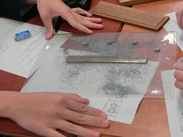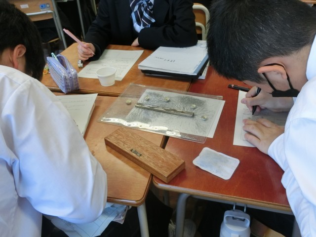 見える磁界 公開日 2025/12/17 更新日 2025/12/17 今日のできごと 1年生の理科は磁界について学んでいます。通常は目に見えない磁界ですが、磁石と鉄粉を使い見える形で表すことができます。磁極と鉄粉の向いている方向をプリントに書き写していきます(菅野) いいね(0) 授業 1年