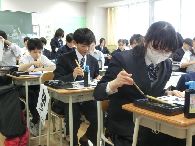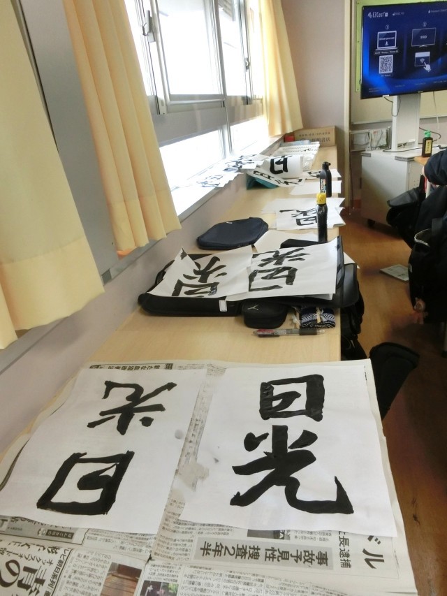 悩ましい‘日光’ 公開日 2025/12/19 更新日 2025/12/19 今日のできごと 与えられた半紙は4枚。その中で回を重ねるごとにうまくなっていくはず。しかし「あ~、ここのハネは前の紙の方がよかった」「全体のバランスは2枚目がいちばんだ」と、どの半紙の文字も一長一短。そんな悩ましい半紙が並べられていきます(菅野) いいね(1) 授業 1年
