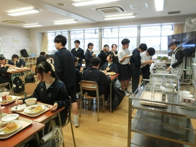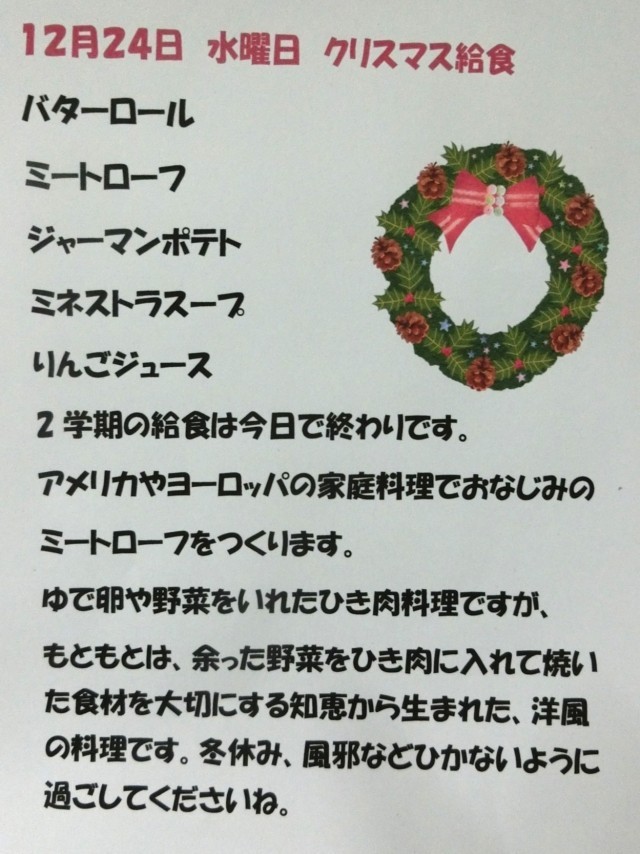 今日で2学期の給食が終わります。そう、最後はクリスマス給食です。もちろん、各クラスに配膳されるおかずの盛りもクリスマスプレゼント並み。ちょうど教室に入った時はジャーマンポテトの前に列ができていました(菅野)