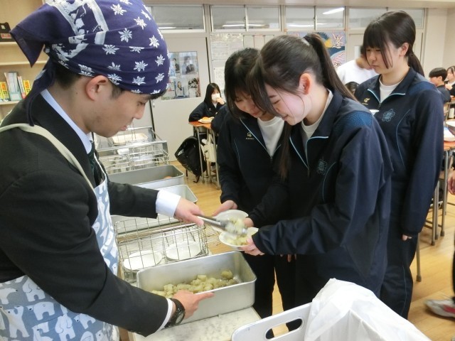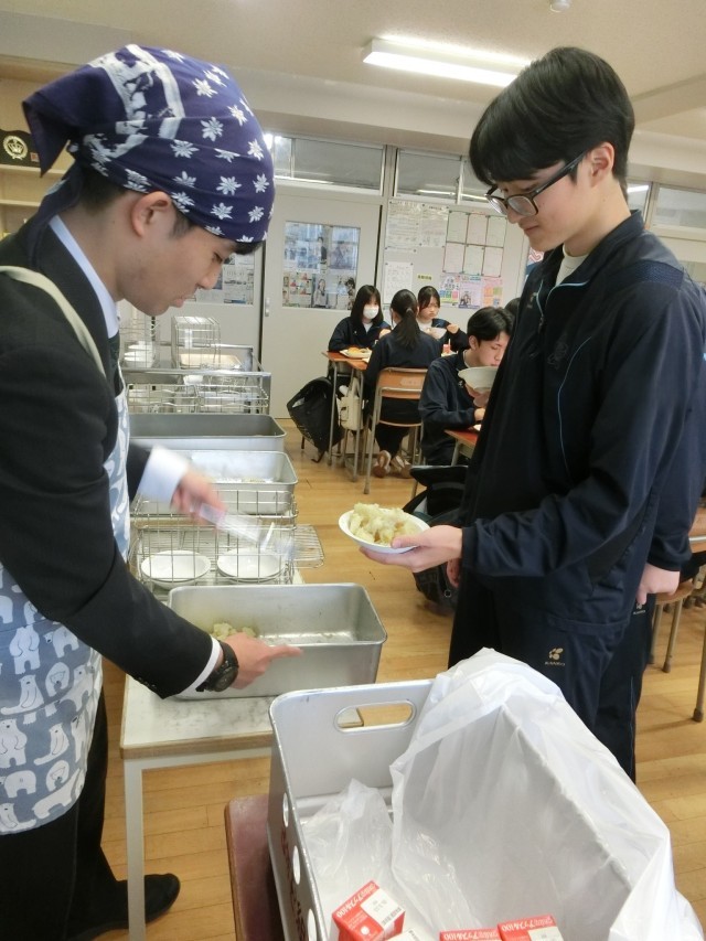 担任の愛情がこもった大盛りの盛り付けに、思わずホクホク顔になる3年生です(菅野)