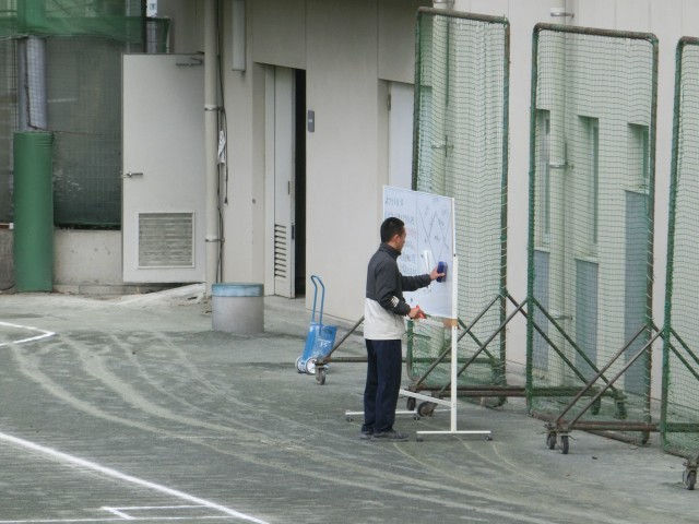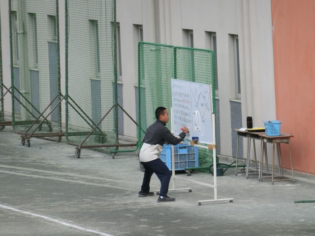 実は野球の授業が始まった前の画像からさかのぼること40分以上前、極寒の校庭では体育の先生がホワイトボードに書いては少し離れ、確認しては修正し、また離れて確認する作業を十数回繰り返し行っていました。初めて野球を体験する生徒にもルールをわかるように伝えるにはどうしたらよいか、を模索する教師の姿です。完成度を高めるためには、いったんそこから距離を取り、俯瞰(ふかん)することが大事であることを教えてくれていますね(菅野)
