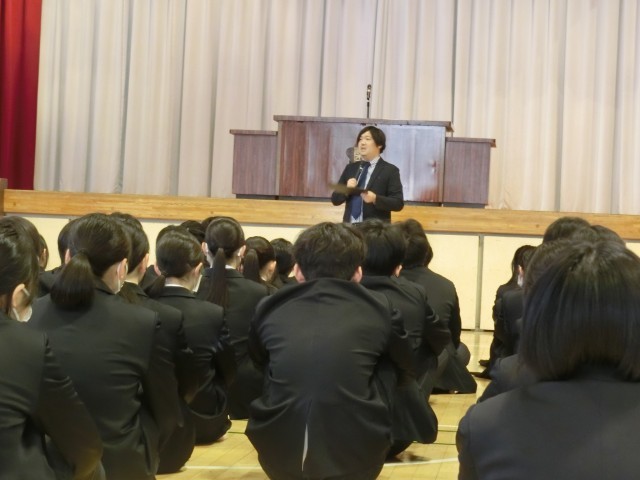 「今年度最後の3学年がそろう朝会でみんなに伝えたい事。それは『自分の行動は必ず自分に返ってくる』という事です。誰も見ていないからこの辺で大丈夫だろう、どうせ周りはこう思っているからやらなくてもいいや、と考えるのか、面倒だけどこれはやっておこう、大変だけどがんばってみよう、となるのか。この違いは大きいし、行動した結果はすぐに返ってこないけれど、必ず将来の自分に返ってくるものです。1年間を振り返り、この行動は自分に成長をもたらしたな、次はもっとこういうことをやってみようかな、と考えることができたら、それはこの1年間の大きな成長の証です。自分の行動が、未来の自分にいつか返ってくると一度考えてから行動することができる人になってください。3年生へ。苦しく大変だった時もあると思いますが『あの時間があったからこそ今がある』と思える日が必ず来ます。残りあとわずかな中学校生活を大切に過ごしてください。1、2年生へ。今度の修了式で『自分が誰にも負けないくらい成長したことは何ですか』と聞く予定です。他の誰かが、ではなくこの自分がやるんだ!という前向きな気持ちをもって修了式までの日々を過ごしてください。まだ、残り時間はあります。自分が成長できるチャンスはまだたくさんあります。皆さん一人一人の、将来の自分をつくる素敵な年度の締めくくり、を楽しみにしています」