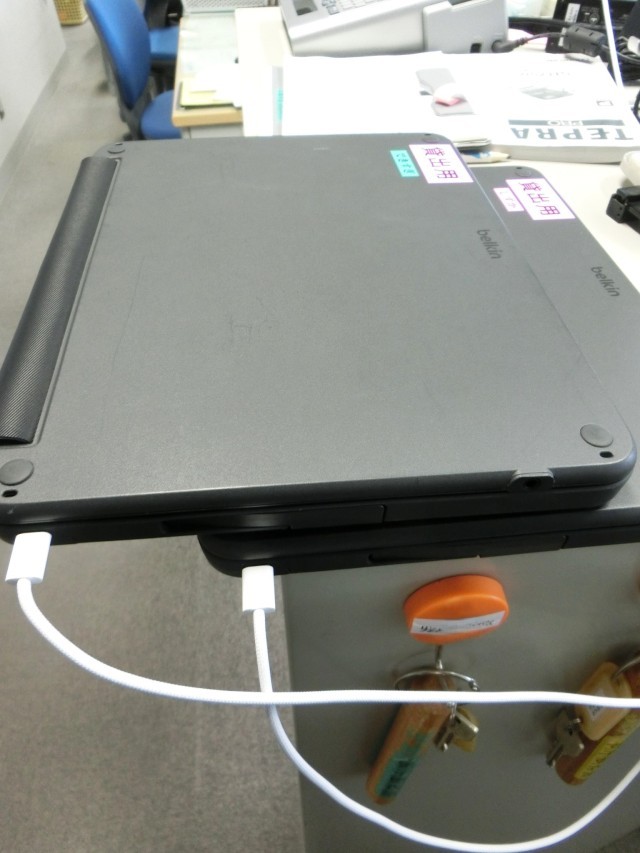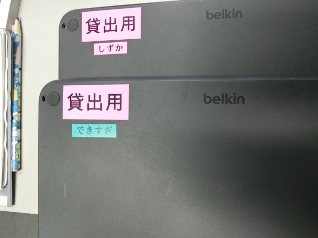 ここ数日「妹のタブレットを間違えてもってきてしまいました。タブレットを貸してください!」と職員室に駆け込んでくる生徒がいました。区内の小中学校で使っているipadが共通であるゆえのトラブルです。友だちや兄弟姉妹のものと混同しないために目印を付けている生徒もいるようです。桜木中ではこのようなケース以外にも、忘れたり充電不足だったりした場合に備えて100%充電済みの貸出用を用意しています。これも生徒が持っているものと混同しないよう名前をつけています。「では、100%のしずかさんをどうぞ」と言って手渡すと、生徒の表情が和らぎます(菅野)