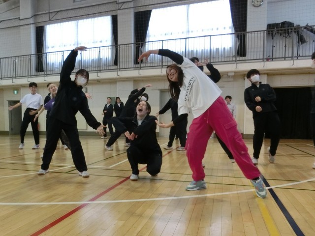 さすが一流のダンサーのお手本のもとレッスンを受けると、素直な桜木中3年生は笑顔ですぐダンスを覚えます。先生とのキメポーズをつくる生徒の満面の笑顔が、楽しさを物語っています(菅野)