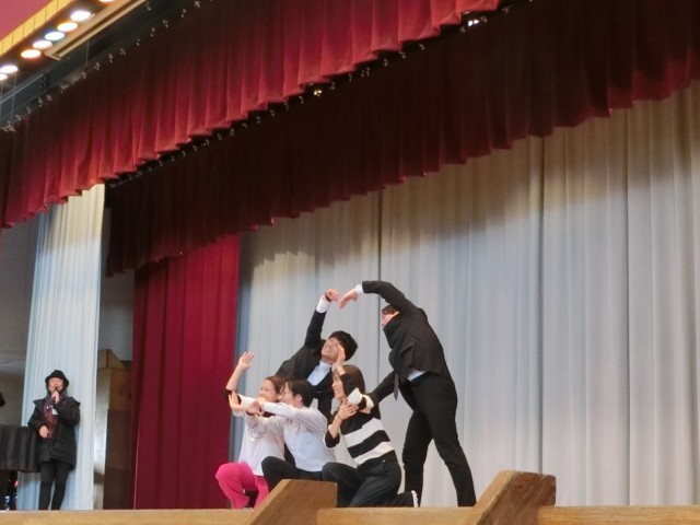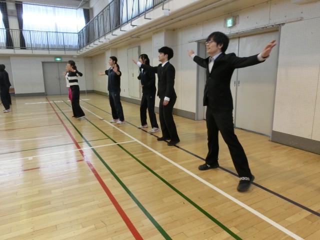 練習の段階から真面目に取り組んでいた先生チーム。発表会のトリをつとめました。最後のキメポーズも何とか成功させ、こちらもほっと一息の笑顔です(菅野)