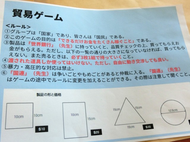 中学校生活最後の社会の授業は貿易ゲームに取り組みます。3年間の学習の成果をみんなでフルに活用します。しかも社会の知識だけでなく、定規やコンパス、ハサミまで使う数学や工作の技術まで動員する高度な内容です(菅野)