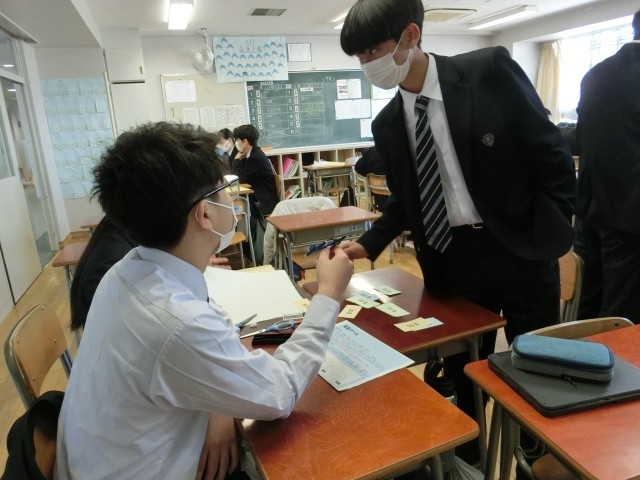 それぞれ自国にないもの、乏しいものを他国から買ったり交換したりする交渉ができるのは‘外務大臣’1名のみ。活発な外交が繰り広げられています。「ハサミ1個と紙1枚を交換しない」「いやハサミはあるから定規がほしい」外務大臣にはタフな交渉術が求められます(菅野)