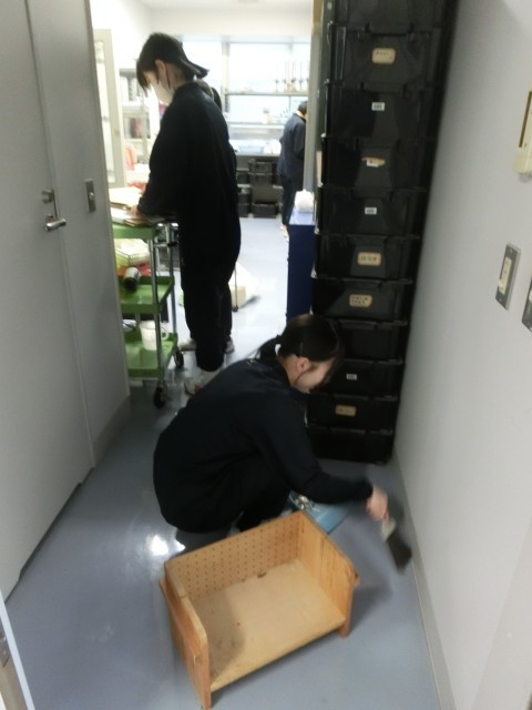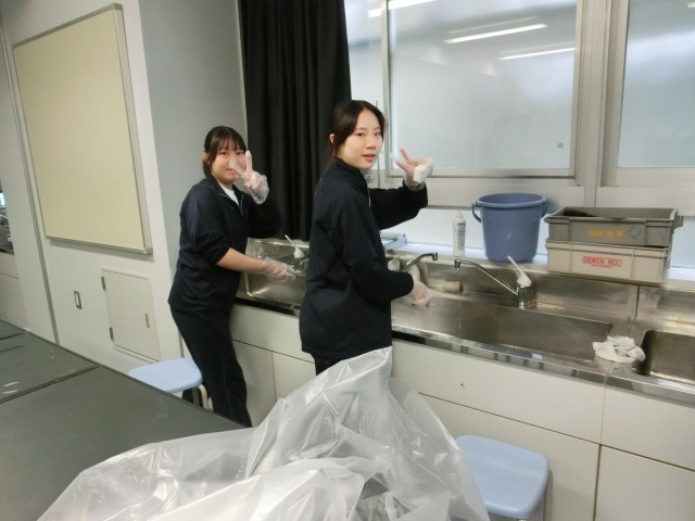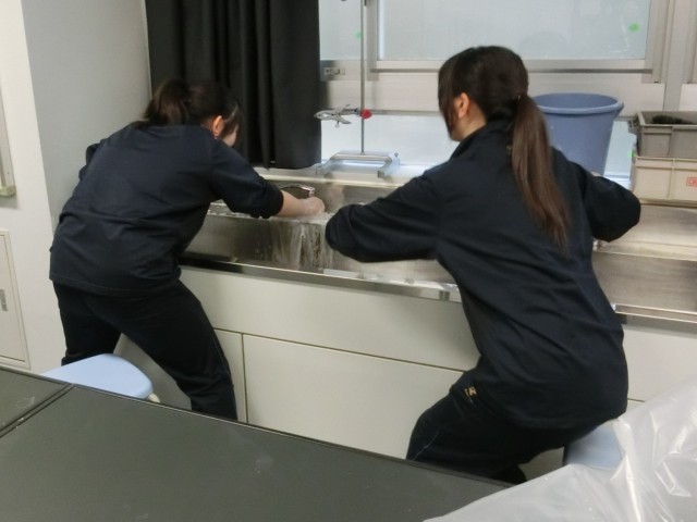 日頃なかなか掃除ができない箇所まで念入りに掃除をする3年生。まさに「隅から隅まで」徹底してきれいにしています。理科室の流しを掃除してくれたふたりは、この画像ではカメラにポーズをとってくれましたが、実は蛇口周りの汚れに相当悪戦苦闘をしていました。その様子は+1を!(菅野)