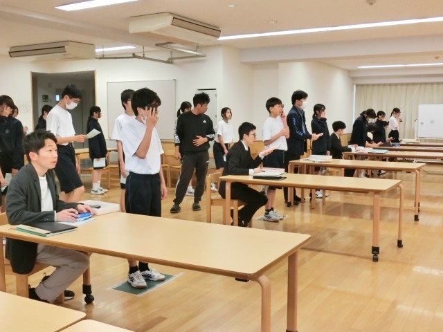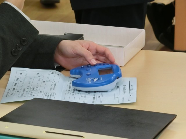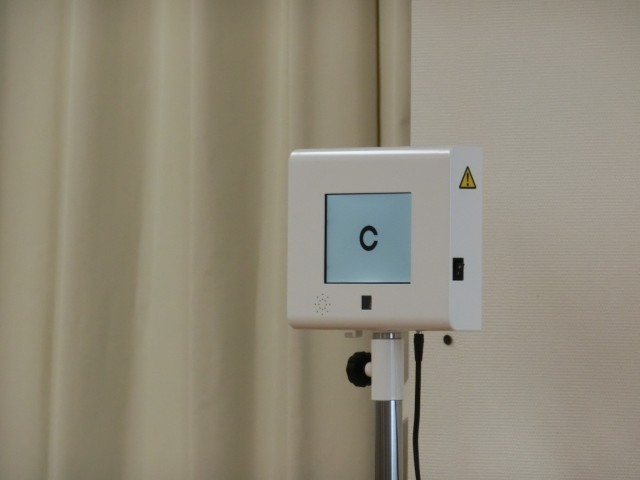 人間ドックの検診や街中の眼科医では当たり前になっているデジタル眼科検診器具。実は学校では都道府県や自治体によってかなり違いがあり、前任の学校では紙の視力検査表を使っていた、という先生もいます。今の桜木中学校は…もちろんデジタルです。記録の先生が、手元で操作すると記号が切り替わります(菅野)