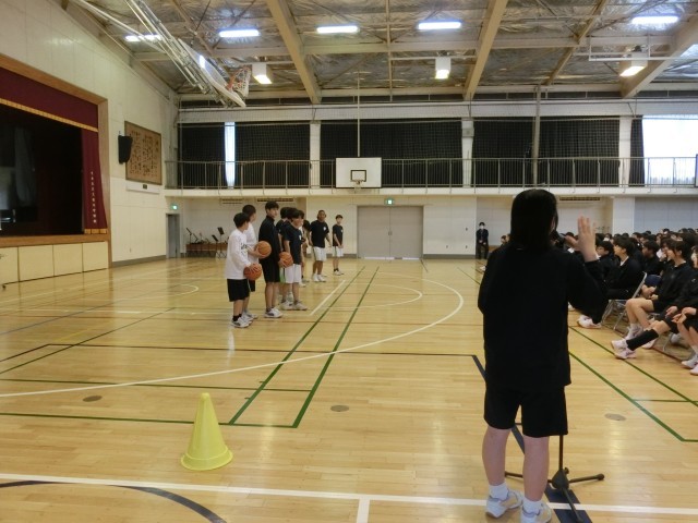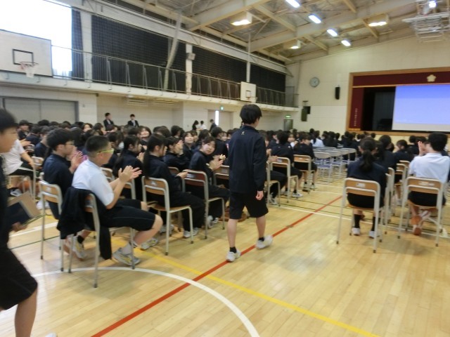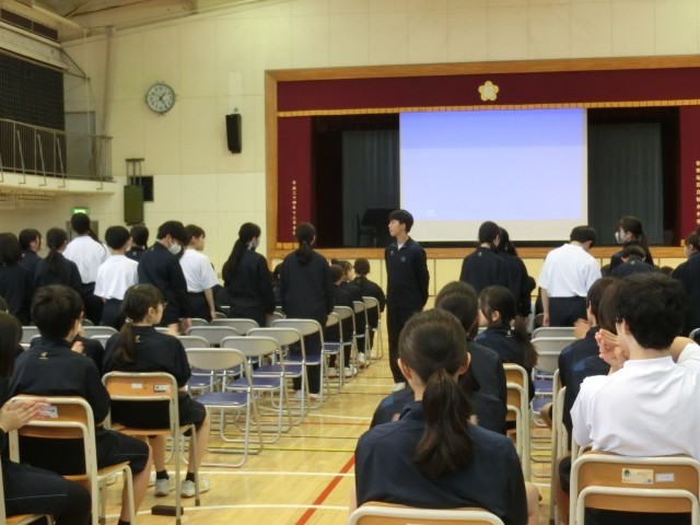 新入生に部活動の紹介をする「新入生部活動紹介」の時間は、入場から終わりまですべて先輩が運営します。入場する時、先頭に立って誘導し、クラス全員が椅子に座るまで気配りをする生徒会役員は‘学級担任’そのものです。『中学校ってこういうところなんだ~!』と実感できる瞬間です(菅野)