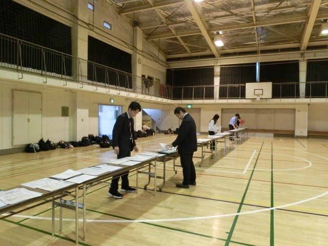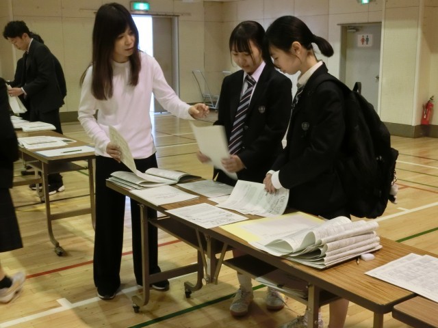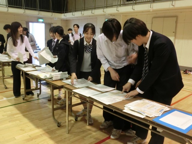 最初の保護会なので、配布するプリントが大小合わせて5種類。重ねて1回で渡せるようにしよう、と先生たちがそろえていますが…もうそろそろ保護者の方が体育館へ入場する時間…どうしよう。と焦っていると椅子並べを終えた3年生が「手伝いますか」と続々と集まってきました。それからは、はやいはやい!!あっという間に500に近い資料の束が完成しました。気持ちが入った中学生の‘人の手’の威力を実感しました(菅野)