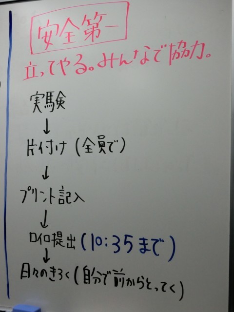 手順を確認 公開日 2026/04/22 更新日 2026/04/22 今日のできごと みなで役割分担を決め、教科書で手順を確認しながら実験を進めている姿に感心しました。ホワイトボードにもきちんと今日の手順が書いてありました。どちらも「安全第一」にはとても大事なことです(菅野) いいね(2) 授業 2年