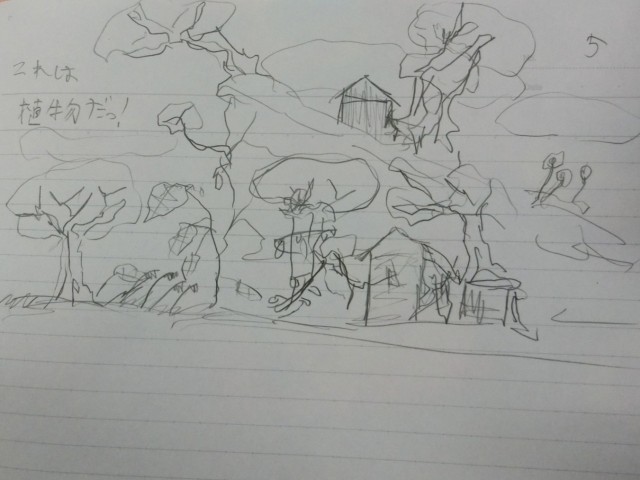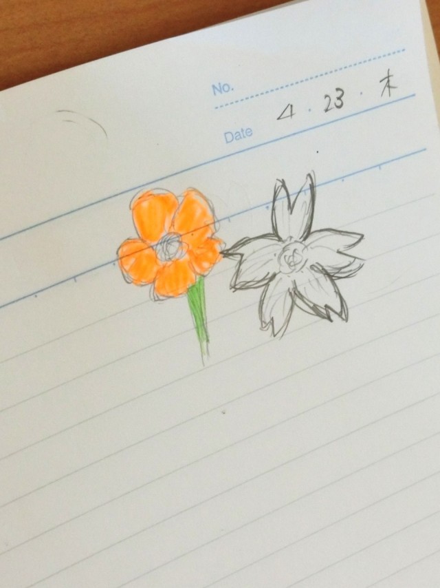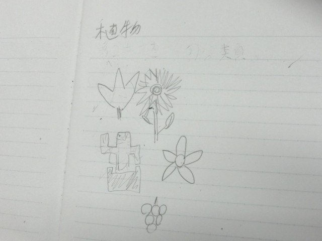 最初に先生から「植物をかいてみよう」と言われてかいたものです。まず、ここから個性が出ていました。「書く」のか「描く」のか、視点が違うだけで全く違ったものになります(菅野)