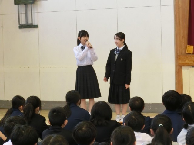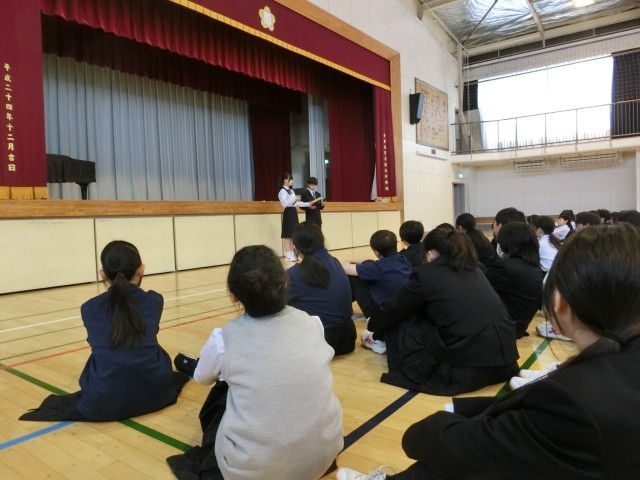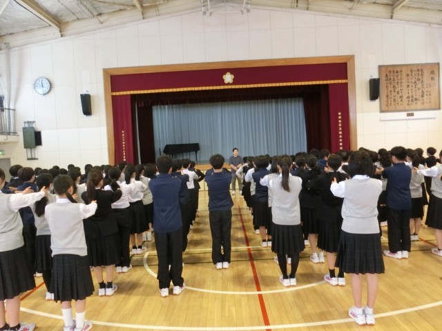 1年 学年集会 公開日 2026/04/28 更新日 2026/04/28 今日のできごと 入学式から早くも3週間。1年生各クラスの学級委員がこの間の学校生活を振り返り、成果と課題について皆の前で発表しました。「明るい。元気。授業に集中している」などの良い面がある一方「授業中のメリハリがない。給食の始まりが遅い」などの課題も出ました。前に立つ学級委員から感じられるのは、前向きな明るい姿勢!この勢いをどこにどんな形で出してくれるのか、楽しみな1年生です(菅野) いいね(1) 生活 1年
