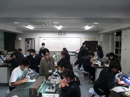 2年生の理科は顕微鏡を使って光合成が行われる場所を細胞レベルで観察しています。大学生ボランティアもサポートしています。