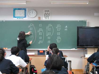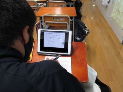 数学は証明問題を解いています。タブレットを黒板代わりにしているので、どの座席でも、オンラインで授業を受けても、同じ見え方で板書ができます。国語は漢文の訓読をしています。読む順序になれるまで、繰り返し練習します。