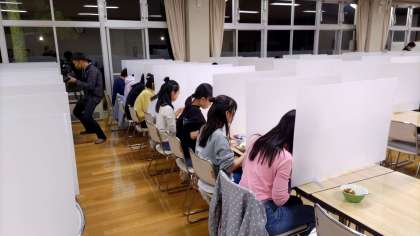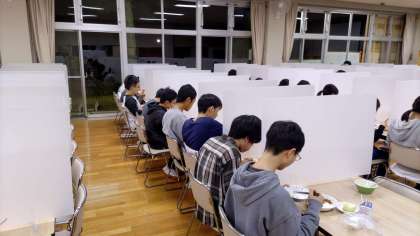 前向きで横一列で食べました。静かでも食欲旺盛でおかわり分が空になりました。