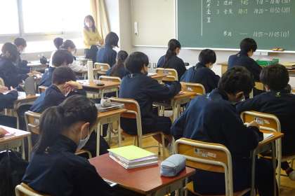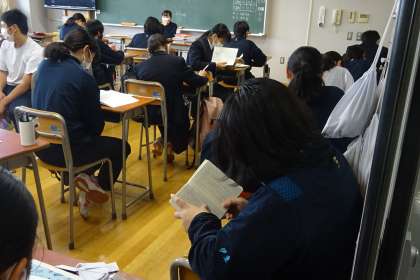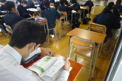 最終日のテスト前、短い学習時間を有効に使う生徒のみなさん。