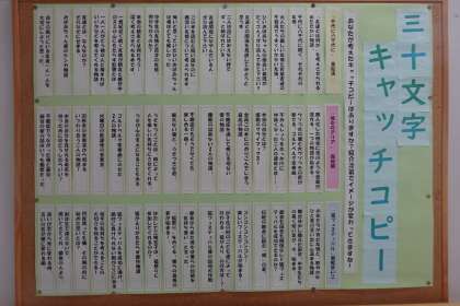 また、2階踊り場の掲示板には、本を紹介する30文字キャッチコピーが紹介されています。その本を表わしていますね。
