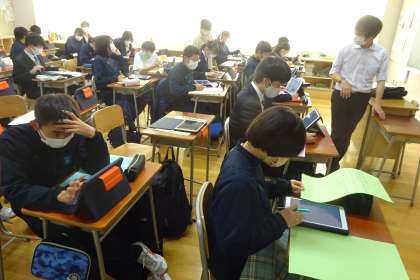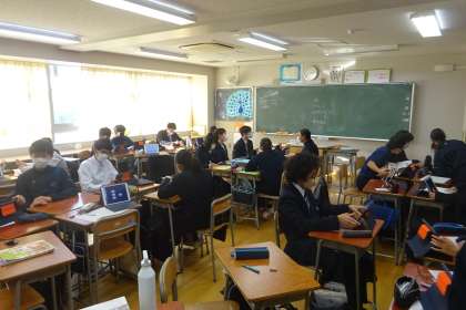 1月末の校外学習に向けて事前学習をしている2年生。個人で、またはグループで調べ学習をしています。