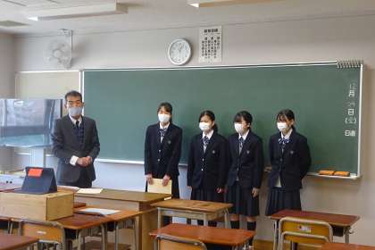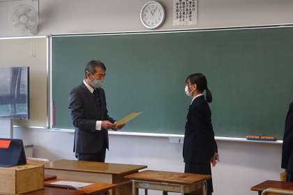 小中学生の部には、中学生が4名走りましたが、それぞれの能力を十分に発揮していました。また、中学生2kmを走ったたいへん多い全員の中で、第5位に入った**さんに個人賞を渡しました。