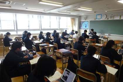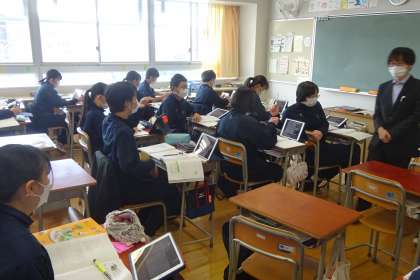 いつもは小グループで話し合い活動をしている数学ですが、個人で前を向いて授業することが多くなりました。