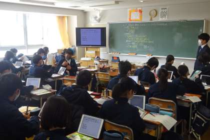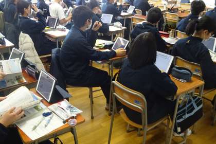タブレット、教科書、プリント、資料集、、、黒板を見て、、、なかなか大変です。資料活用能力、情報整理力、もっている力のフル活用です。