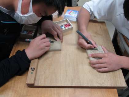 2年生の美術では篆刻と印箱の作成をしています。篆刻も印箱も一人一人のオリジナル作品です。